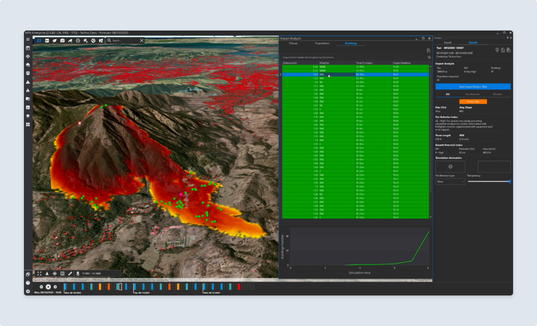 La figura anterior presenta un ejemplo de la interfaz del software FireSim que muestra una predicción a 6 horas con edificios afectados. El mapa en 3-D muestra la hora de llegada del fuego, codificada por colores según el frente de incendio. Se proporcionan herramientas para ver el mapa por pasos de tiempo si se desea, o para animar el mapa. Los puntos verdes representan la ubicación de las estructuras. El panel de resumen del análisis del impacto muestra una lista de los edificios afectados por el incendio, ordenados por "tiempo desde la ignición". La información se calcula para cada edificio afectado: