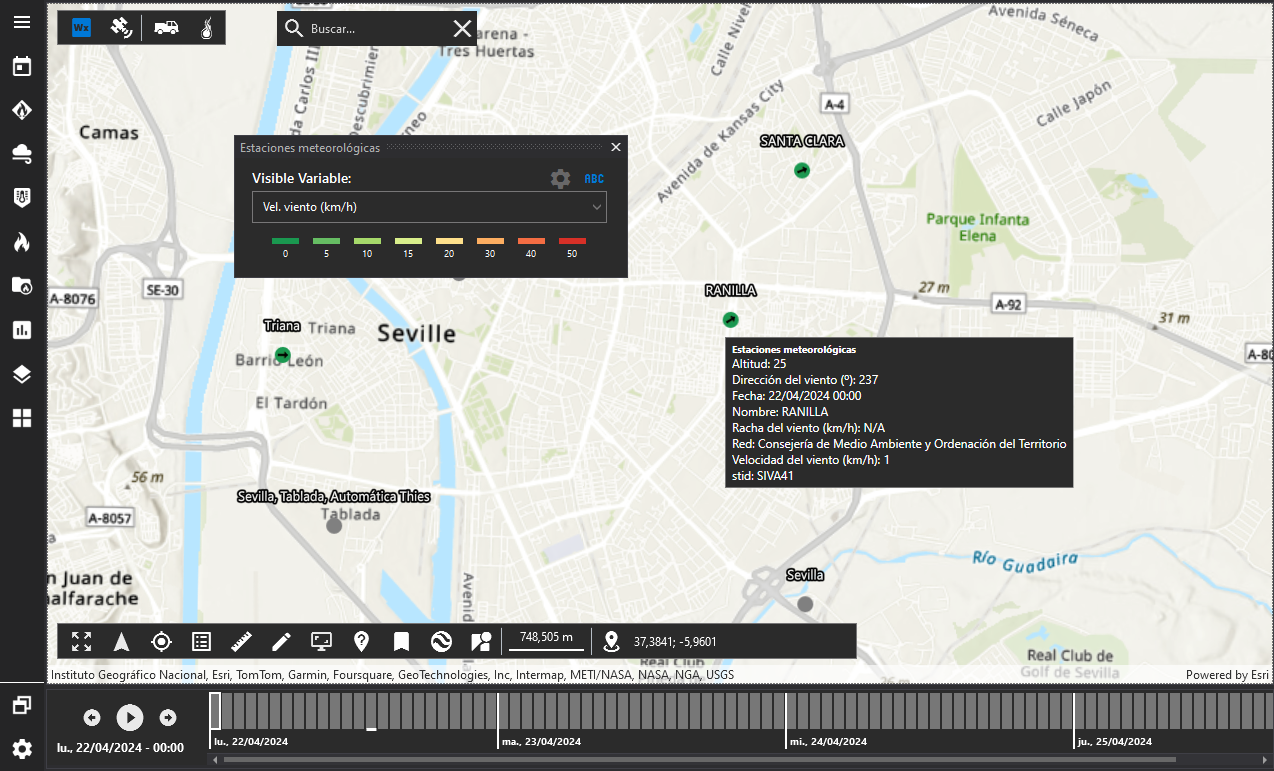 Seleccione Velocidad del viento (Km/h) para ver las estaciones por velocidad y dirección del viento observado. Los colores de la velocidad del viento coinciden con los de la herramienta Previsión meteorológica y van del verde oscuro (baja velocidad del viento) al rojo (alta velocidad del viento). Las flechas muestran la dirección en la que soplaba el viento en el momento observado.