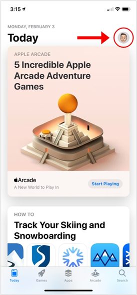 2. Tap on your Profile Image, located in the top right-hand corner of App Store homepage.