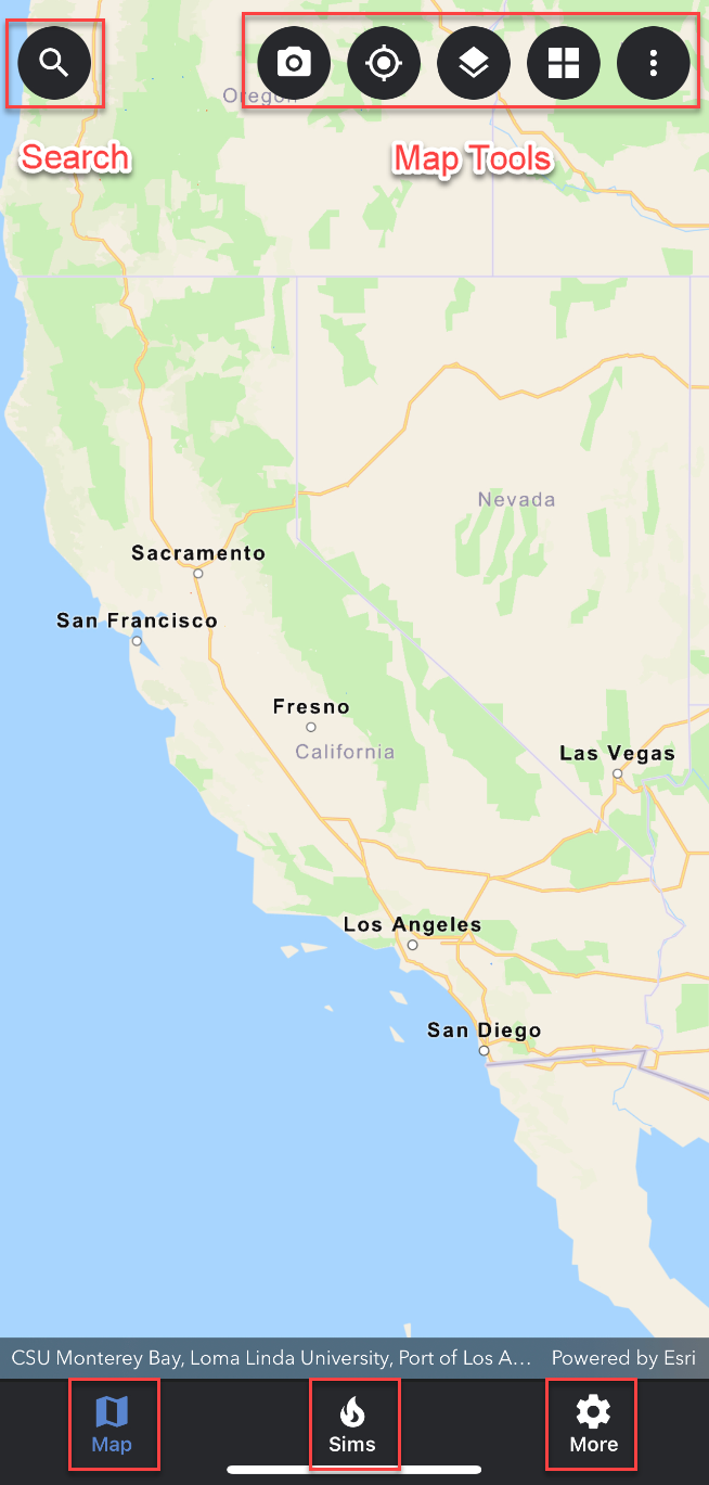 The WFA Mobile user interface is divided into 3 distinct tabs: Map, Sims, and More. Use the map tools to create, view and control simulations, as well as, select ALERTWildfire cameras and IRWIN incidents. Use the search tool to search for a specific latitude and longitude as well as search for a previously created simulation.