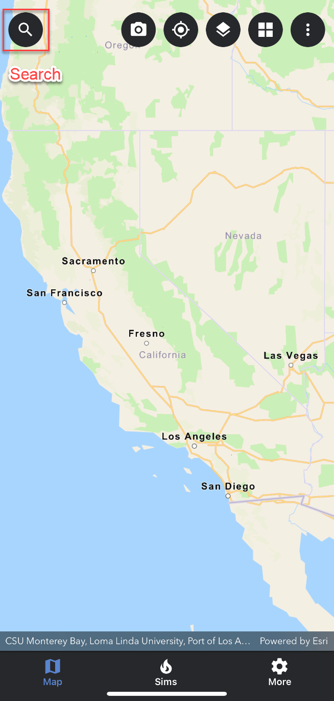 The search bar is located at the top left corner of the map screen. It can be used to search for a specific location to help you narrow down your area of interest quicker. You can either search for an address or enter latitude and longitude (lat/long) coordinates (ex. 38.197168, -120.241150).