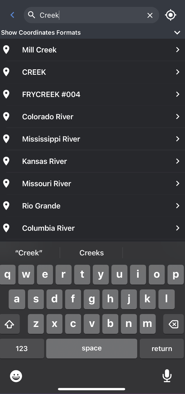 Once you have entered the lat/ long, you will need to tap the enter button on the keyboard to complete the search. The entered lat/ long will then appear in the search results, where you can select that lat/ long to view the location on the map.
