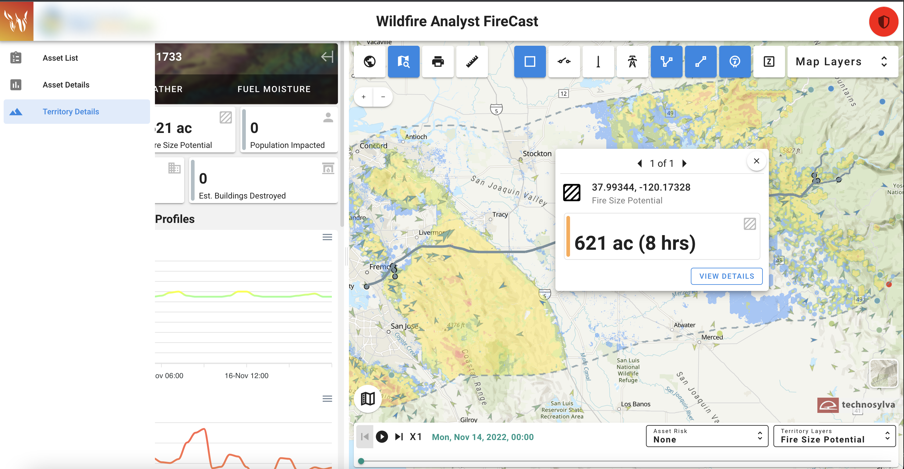 When viewing territory layers on the map, you can click anywhere within the domain boundary to view details of the Territory Risk metrics. You can either navigate to the left-hand tab to select this new feature, or you can click “View Details” from the pop-up window when you select any point on the map. Use this new Territory Details tab to view details for any of the territory metrics: risk, weather, and fuels throughout your service territory.