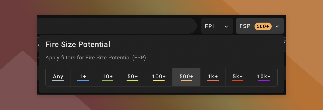 Fire Size Potential filter applied. Filtering the asset list to only show assets with a FSP of 500 or more.