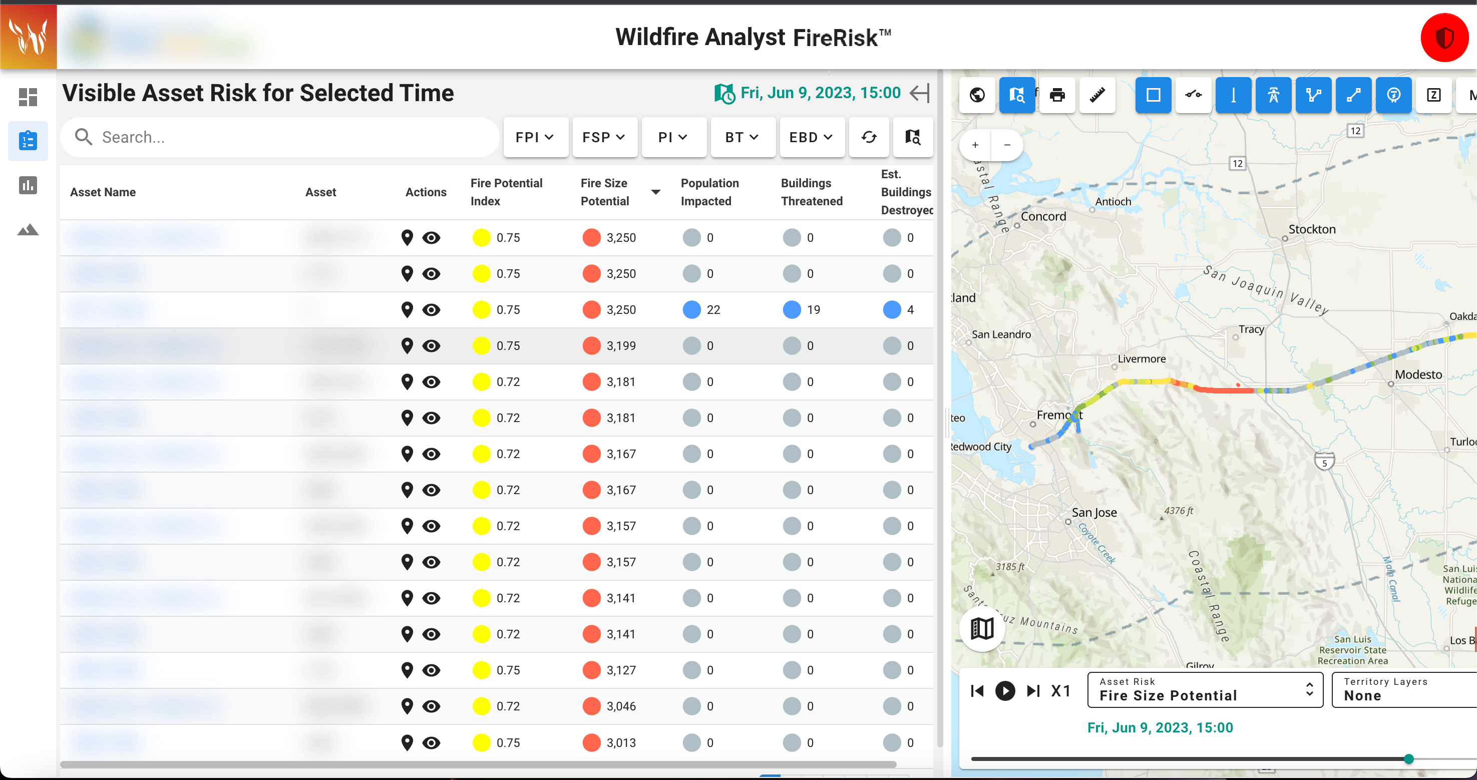 Asset risk can be viewed on the map and in the asset list for your assets. Asset risk is calculated at 3-hour intervals across the entire forecast. Risk may be viewed for each of these time intervals of the forecast for each asset. This provides you with a visual representation of asset risk on the map showing which assets are the highest risk at a given interval in the risk forecast. Risk metrics are also displayed in the asset list for the selected interval to quickly identify a specific asset's risk.