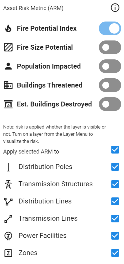 The specific asset type map layers must be turned on for the asset risk to be visible on the map. For example, if you have Transmission Lines selected in the risk metric selection pop up as seen above, but the transmission lines map layer is not turned on in the map layers panel, you wont see your transmission lines with their asset risk on the map. This has been done to give you complete control over what asset types you want to see and which ones you want the risk metric applied to.