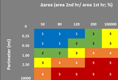 GPI uses the fire perimeter in miles for the first hour of fire growth with no intervention of suppression resources and fire area growth from the area of a fire spread simulation two hours after simulation started divide by the fire size in the first hour as follows.