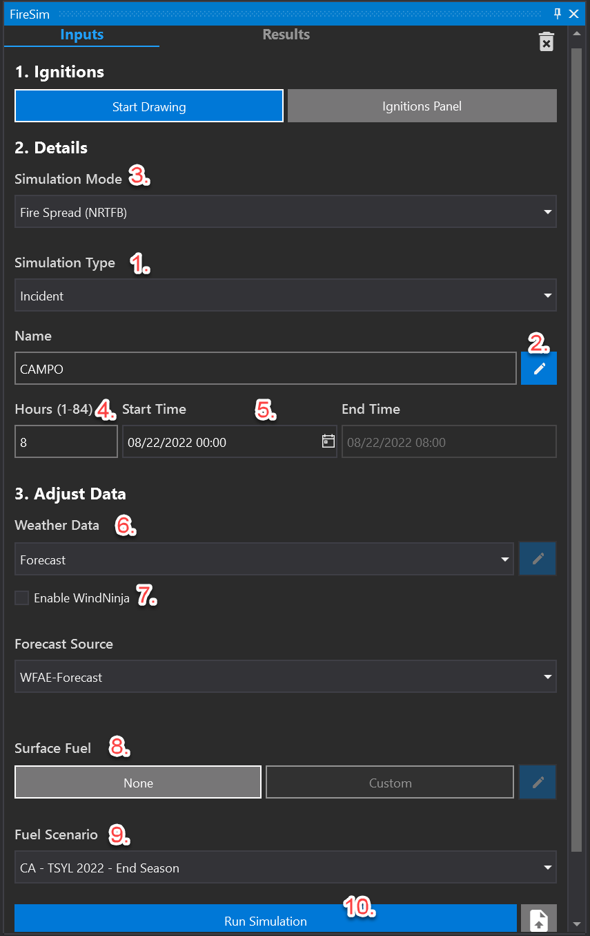 Before starting a simulation, choose your start time from the timeline tool. You may find it helpful to display IRWIN incidents on the map prior to starting an Incident Simulation. Then follow the steps below to run an Incident Simulation.