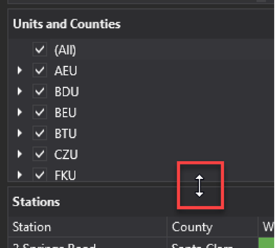 Several dashboards are included in Wildfire Analyst. These may include: Asset Risk, Weather, LFM Stations, Hotspots, FireSim Use, Risk by Unit, or Incidents by Unit. Select a dashboard and a new panel will open with information pertaining to the dashboard selected. It may take a few minutes for all of the information to load.