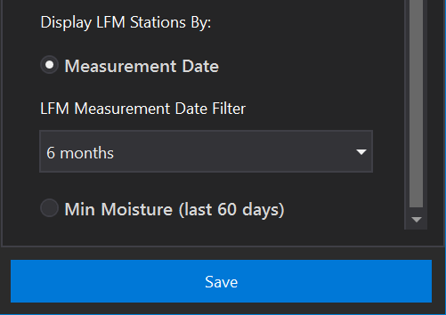 LFM Stations can be displayed by minimum moisture readings. As a default, only stations with readings in the last 60 days are displayed. To symbolize stations by moisture readings, go to Settings > Weather Defaults and scroll to the bottom.