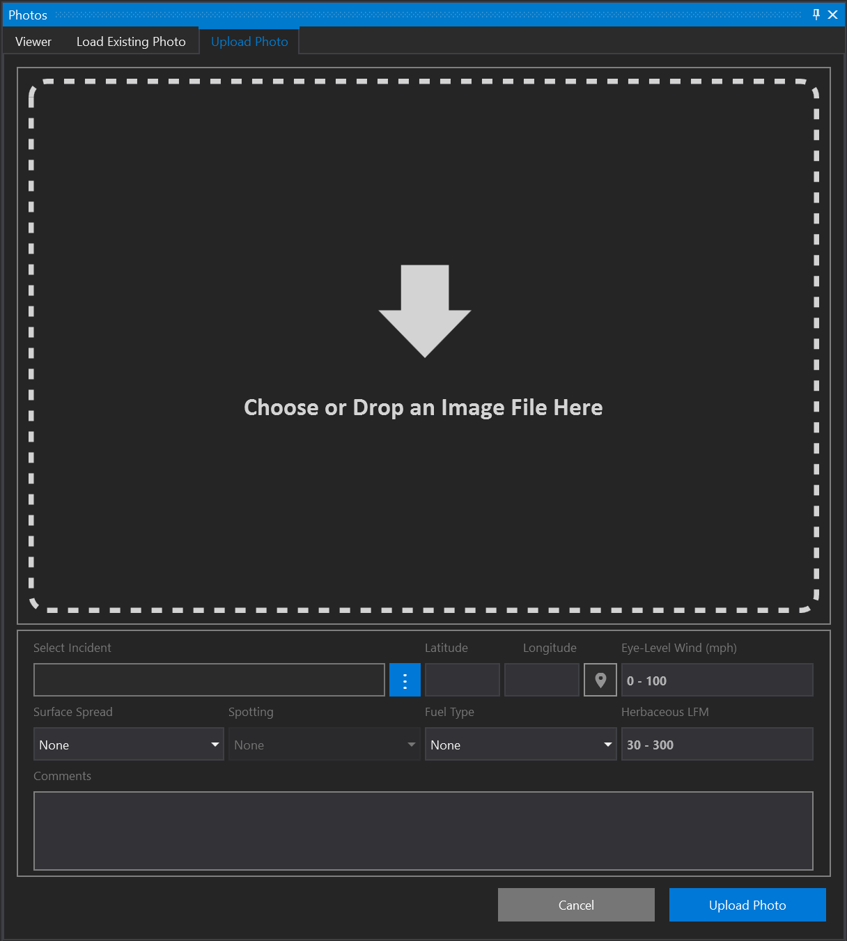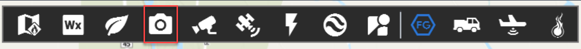 Toggle the Mobile Photos button on to see any mobile photos taken in the selected forecast. Mobile photos taken using the FireSim Mobile application will appear in desktop with a mobile photo icon on the map. You may also view the photos on the Load Existing Photo tab.