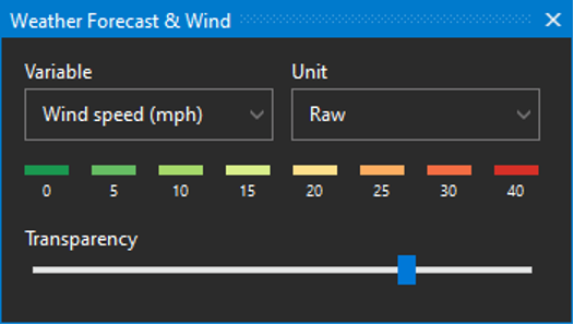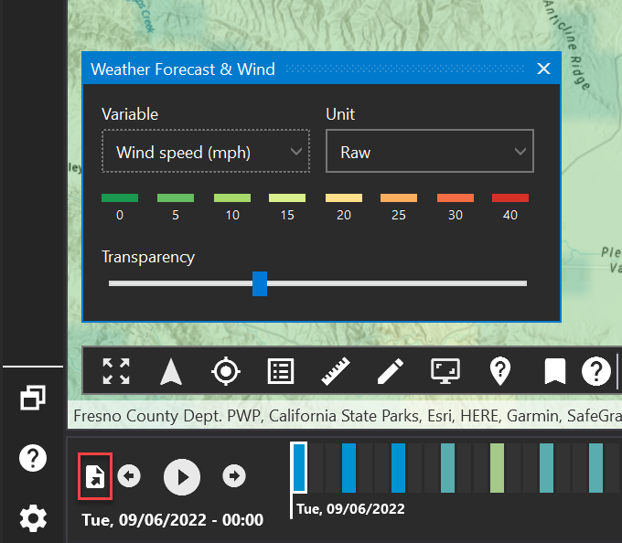 This tool allows you to view the weather forecast for the selected date/time on the timeline.