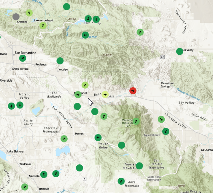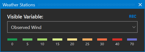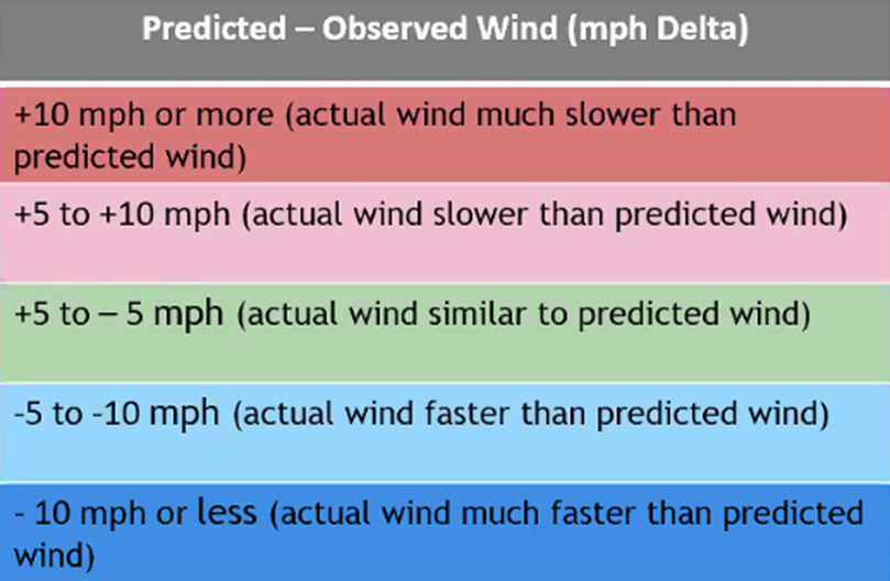 Select Wind Speed Delta to view weather stations color coded by the Predicted Wind Speed minus the Observed Wind Speed.