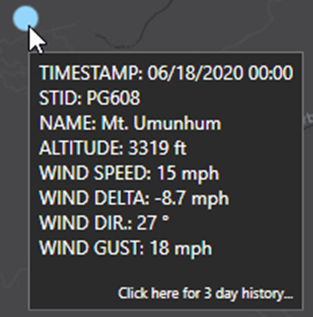 Click anywhere on the info popup to open a web browser and view historical information for that station.