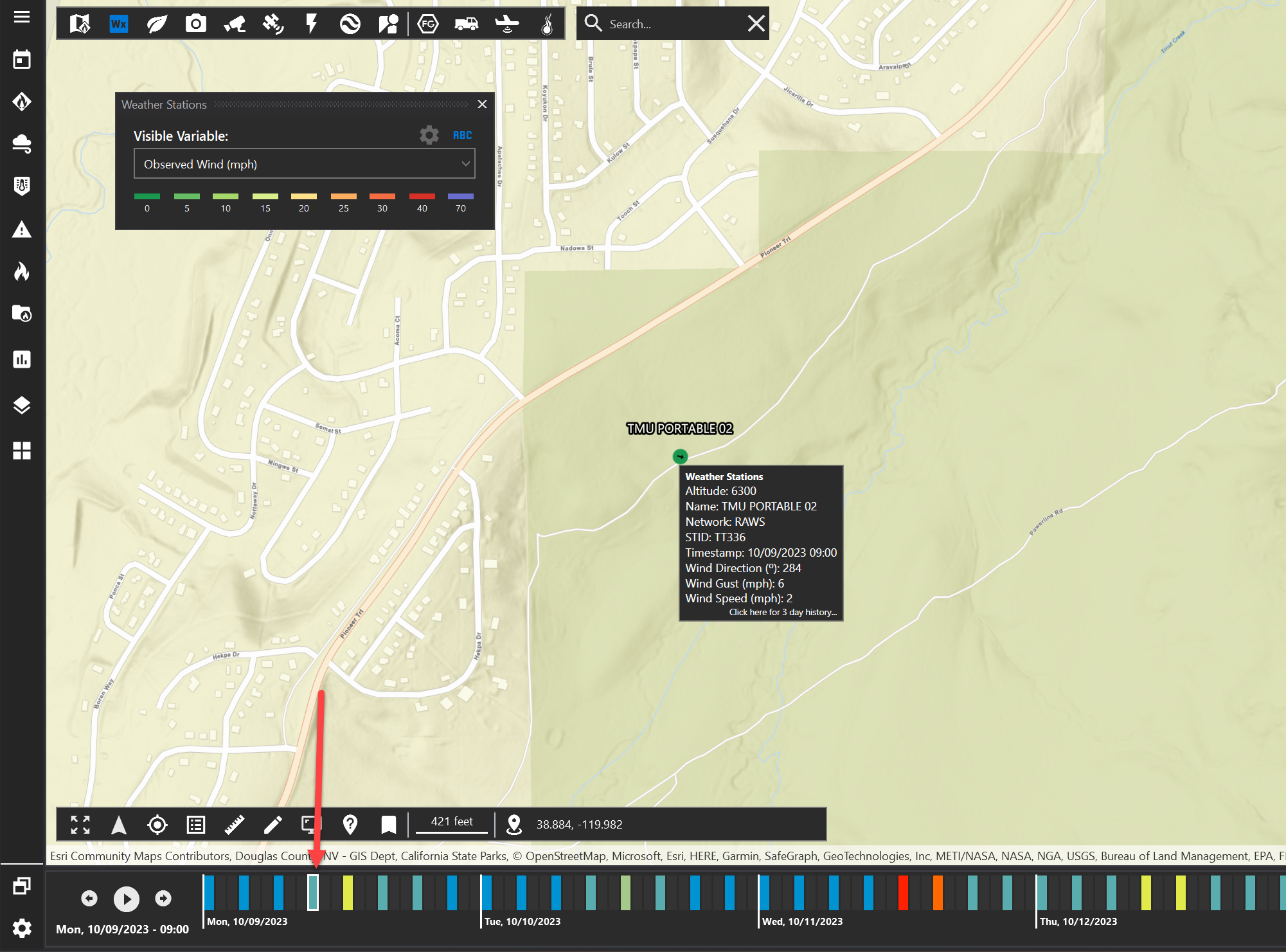 Click on the arrows to view more information about the weather station. Use the timeline to view observed wind speed and direction for other times in the forecast.