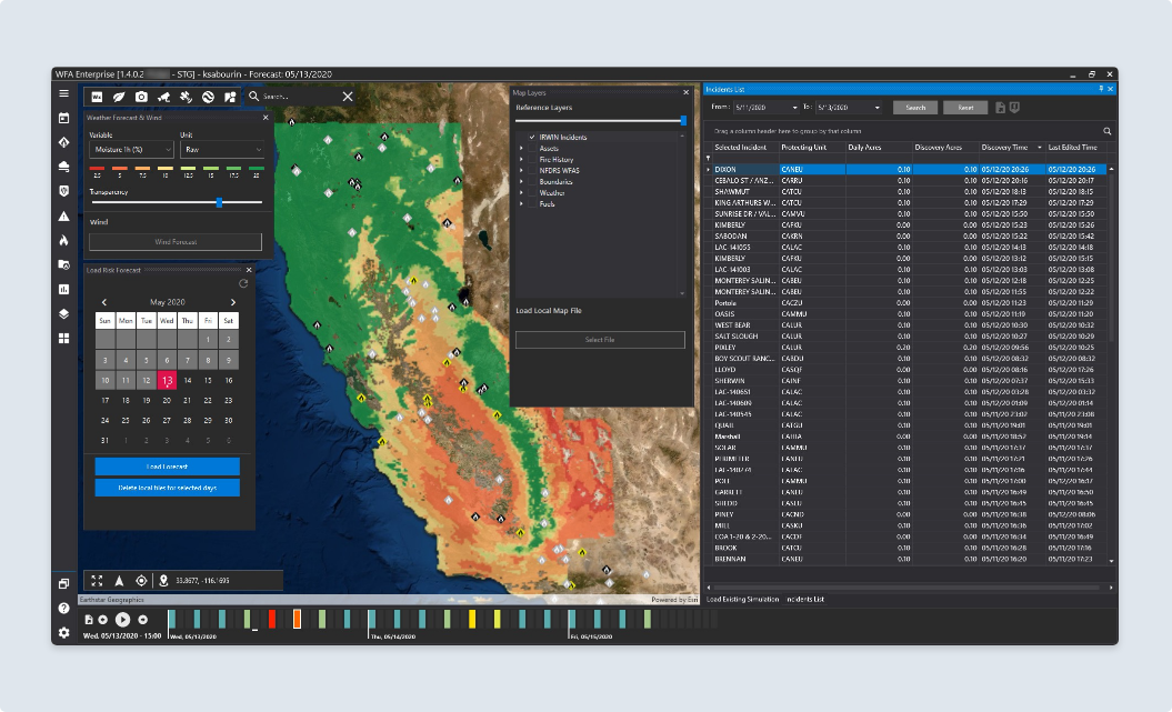 The above figure presents an example of the FireRisk software interface showing 1 hour Fuel Moisture for 05/13/2019 at 3:00 pm. CAL FIRE incidents are also shown in addition to the forecast selection tool.