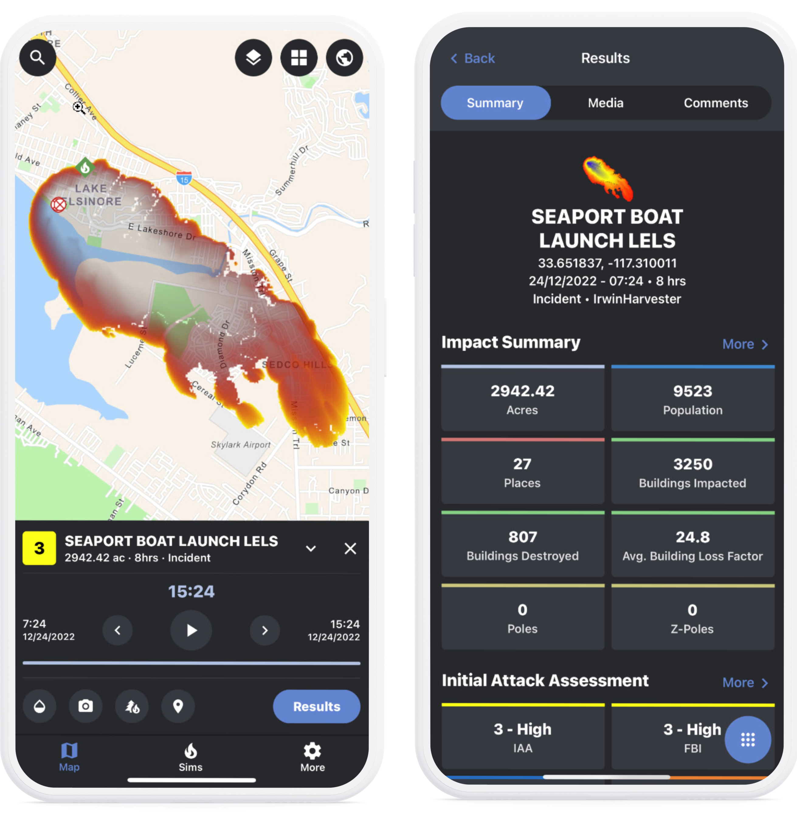 Each prediction includes full impact analysis and provides tools to review the prediction extent on a map (in 10 min intervals), review the impact results with an Initial Attack Assessment metric, and retrieve previous simulations from the cloud-server on request.